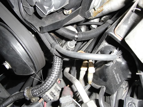 矢印のホース前後のバンドから漏れていてエアコンコンプの下側までベットリです