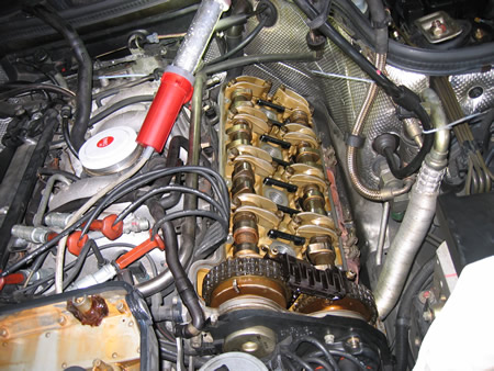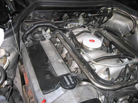 ヘッドカバーガスケットからのオイル漏れと思われ矢印あたりからエンジンが暖まると煙が発生!危険です。 作業開始の前に、まずバッテリーの端子外しエアマスにはゴミが入らないようキャップでフタを。 |