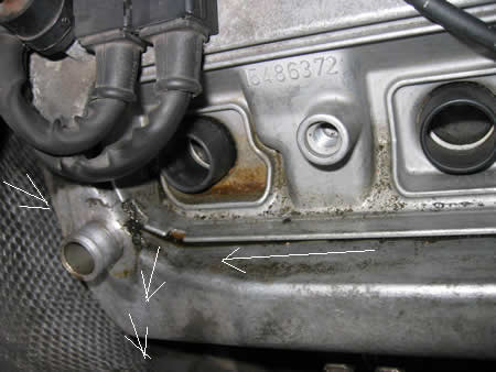 どうにかヘッドカバーが外れた。オイル漏れは矢印部分が一番多かったようです。 |