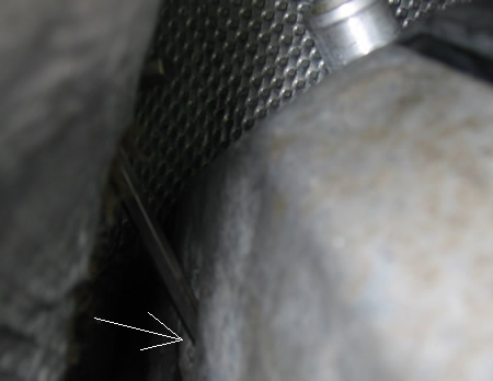 まずヘッドカバーの外しですが右バンクの奥にあるボルトにアクセス出来ません。 ヒートシールドをちょっとだけカットしてアレンキーの入る場所を確保 ここの間隔は20mmくらい!? ひょっとしてエンジンマウントが落ちてクリアランスが少なくなっている? |