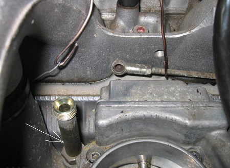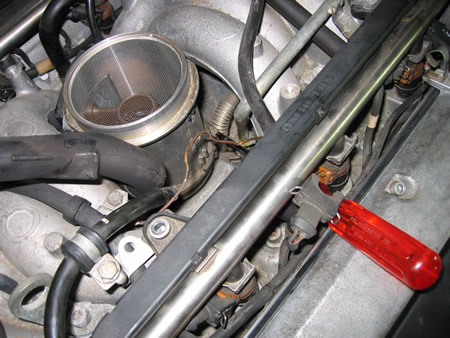 スロットルリンクはパチンとはまっているだけ。リターンスプリング共々針金で固定 矢印のブレーキブースター負圧配管は自作SSTで外します(2面幅19mm) |