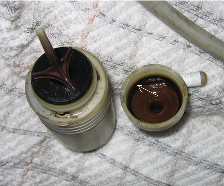 色々調べたらポンプの矢印部分から漏っている模様。 ここに液体シール塗布 一晩養生して組み立てたら止まりました |
