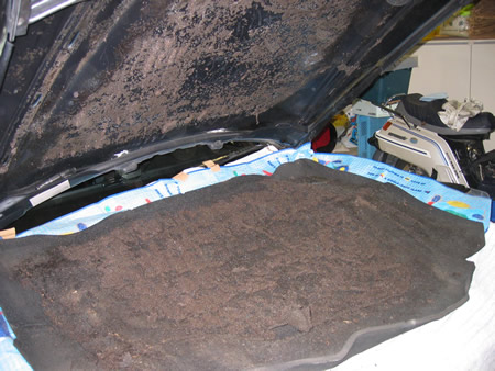エンジンハーネス・POSケーブルなど部品待ちの間にフードインシュレーター交換 画像は剥いだところ |
