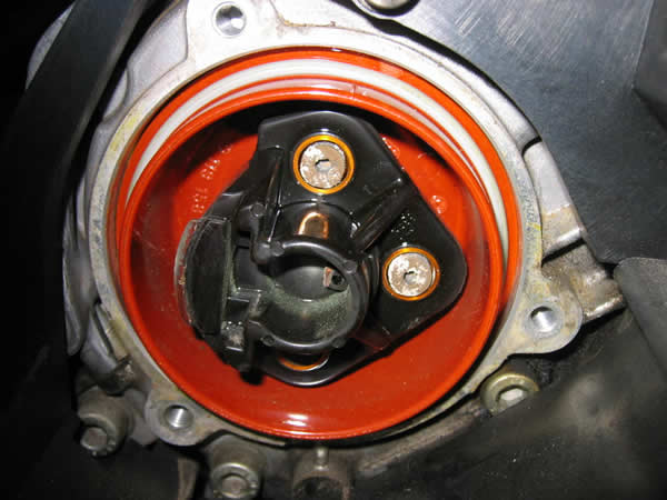 3本のボルト(矢印)をゆるめデスビキャップを外します