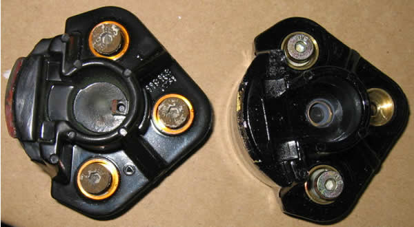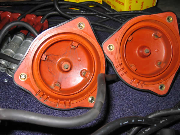 左が右バンクのデスビローター。イナズマ模様のような電気がリークした痕跡が残っています。