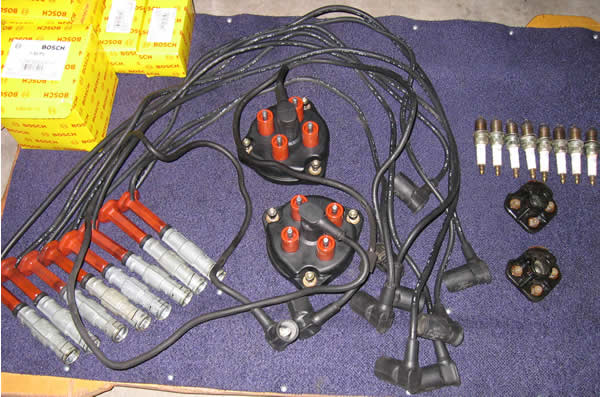 デスビキャップ内側に湿気が混入し夜間エンジンが冷えると水滴となっていてエンジン始動後暖まるとエンジンの熱気で水蒸気となり高電圧がリークしたのではと推測し点火系統交換です。 デスビキャップ・ローター・ハイテンションコード(サプレッサー付き)・スパークプラグのセットで\51000でした。