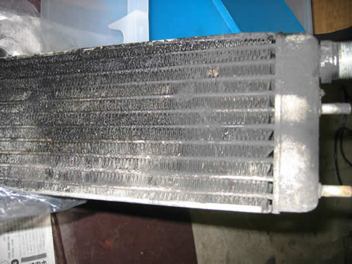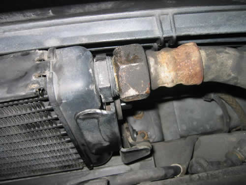 2柱リフトをかりてオイル受けも使い作業開始。 エンジンオイルはサーモスタットでオイルクーラーのラインを制御しているので冷間ならばオイルが大量に流れ出ることは無いと判断、予想通り多くたれてきません。 穴が開いてベットリと汚れたオイルクーラー。 外しながら解ったことは段差などで「もし」ぶつかったらという配慮でしょうか・・自在に動くように取り付けられていました。モンキーレンチ2本で「入りと出」の配管外しました。