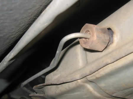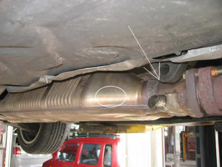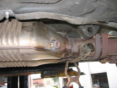 触媒の○あたりにセンサーを取り付けます。 矢印は外した吊りゴム |