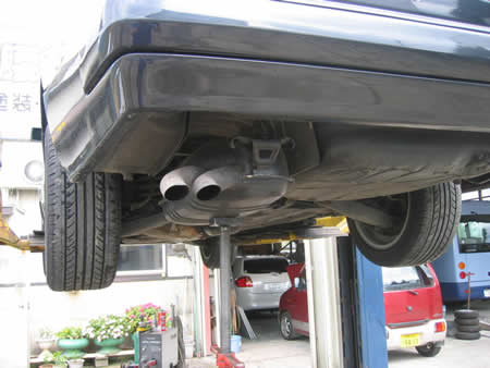 リフトで上げてマフラーの吊りゴムを外し作業スペースを作りました。 |