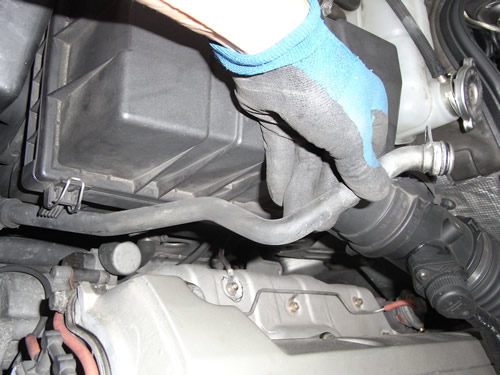 フロントカバーの前にあるラジエターホースも外しヒーターバルブからのリターンホースも外しました。