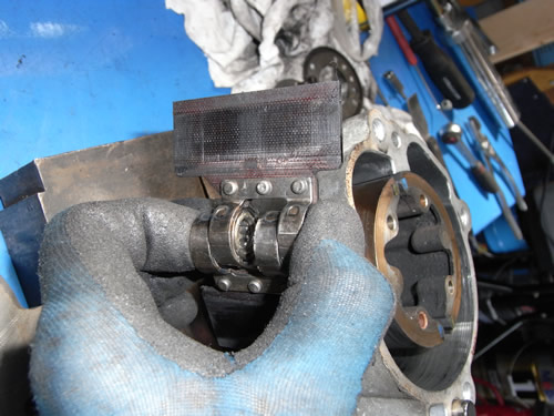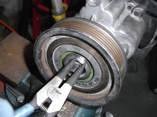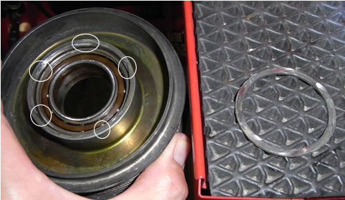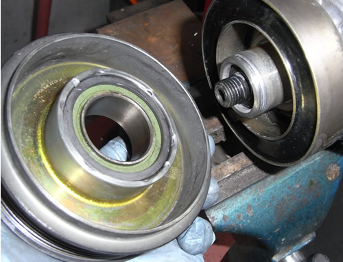 プーリーのベアリングは右のリングが押さえで入っていて○印部分をカシメてあります。このカシメを削りリングを外してからプレスでベアリングを抜きました。