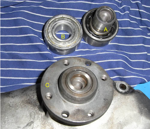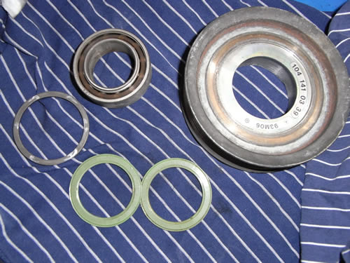 ●このブラケットは新品の定価が4.5万円ほど(104 200 13 28)ですが手間をかけCのフランジをプーラーで抜き、アルミ製のブラケットからベアリング(ボス一体)を抜きます。旋盤で作ったボスを5204ベアリングへプレス圧入し組み立て。正確にオフセットなどを計測しながら微調整しました。