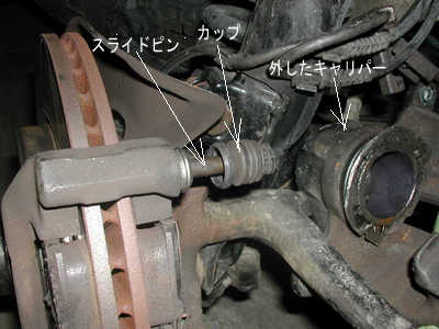 ここでは必ずカップ(ゴム製のジャバラ)をめくりスライドピンをチェックします。サビなどがあり前後の動きが悪い場合ブレーキのひきずり、編磨耗、ジャダーの原因となります。出来ればスライドピンを抜き洗浄、ペーパーで磨き新しいブレーキグリスを塗布し組み立てます。カップにヒビや亀裂があれば当然交換です。カップパーツキット