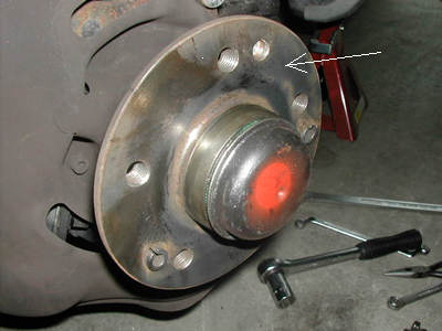 ブレーキキャリパーを固定しているブレーキアンカーを外します。矢印の2面幅19mmボルト2本です締め付けトルクは110Nm