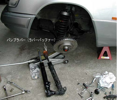 ジャッキアップ後タイヤを外しウマに車体を載せFナックルの下からジャッキですこしサスペンションを縮める。(2〜3cm)