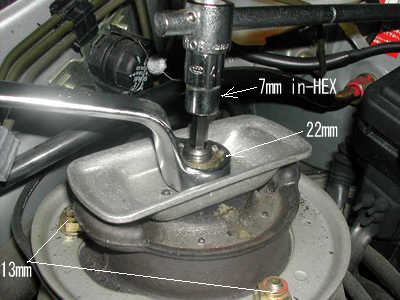 ダンパーのみの交換では画像のストラット上の固定 7mmのHEXで押さえ22mmのレンチでナットを緩めます。締める時のトルクは80Nm 組み立て時は新しいナットを使います。普通はショックアブソーバーに同梱されている。ディープオフセット(75°)のメガネレンチが必要です。