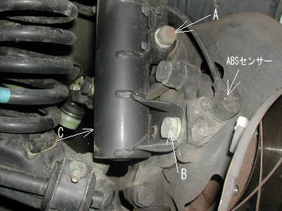ダンパー下側の固定はA,B,Cの3箇所19mmのレンチで緩めます。