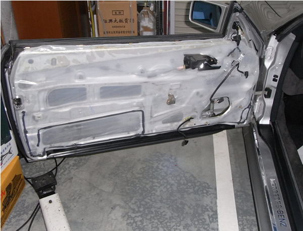 外した内張り。W124とはちょっと違う方法で取り付けられていました。