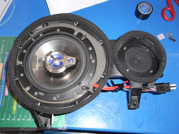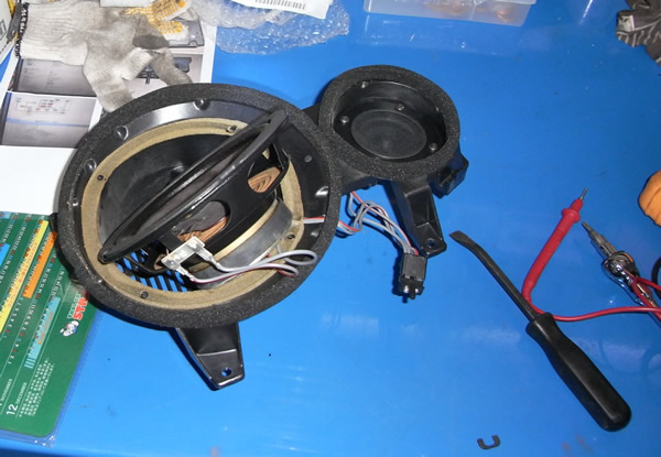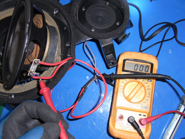 ドアの中、コネクターから新しく線を引き調べたらウーファーのインピーダンスが27Ωと異常な数値。ボイスコイルの断線と判断し交換することにしました。