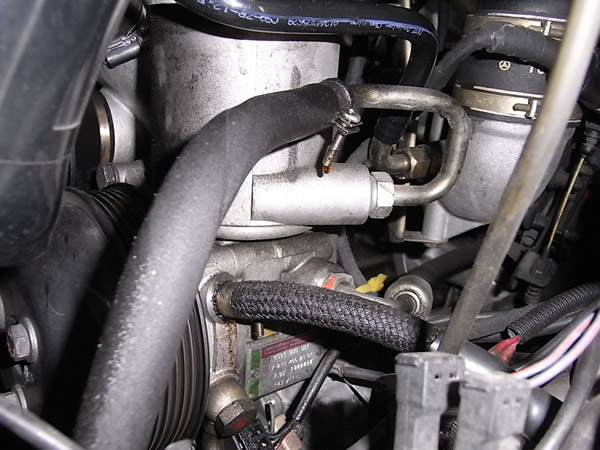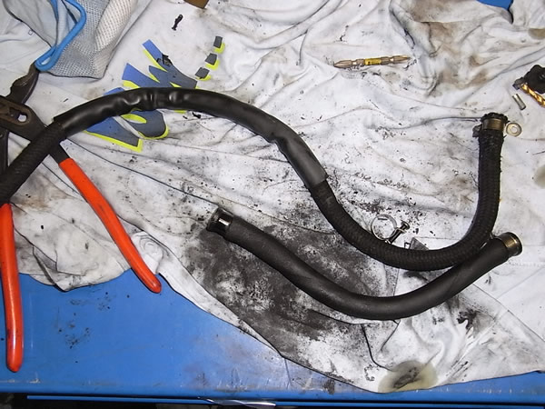 外した2本のホース。上の長い方がリアレベ