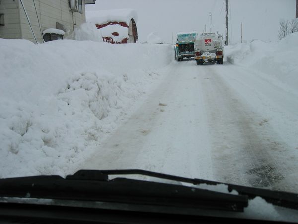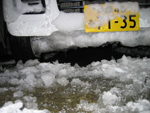 2006年1月5日撮影:元旦に晴れただけで2日以降はずーっと大雪が続いています。 これは仕事クルマの画像です。足回りに氷が付着しハンドルの切れ角が少なくなり轍の路面ではおなかをこする状態です。 撮影後お湯で溶かしましたが・・・。もう少し雪が付着しにくい構造は出来ませんかね? |