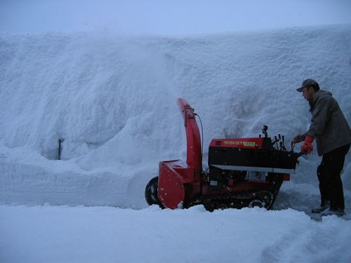 これはロータリー式除雪機で自宅前の作業風景 機種や雪質にもよりますが10m-25mまで遠くに飛ばすことが可能です。 ただし飛ばす場所が必要。 小型の50万円ほどから大型駐車場用380万円あたりまで機種は豊富です。 |