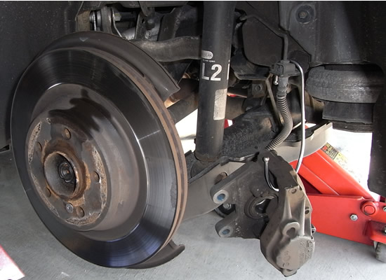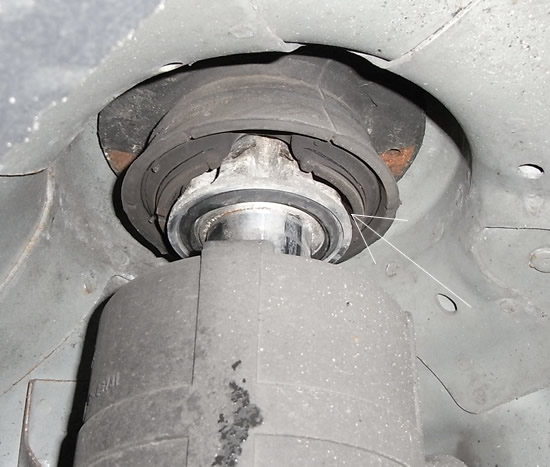 その他点検 矢印の部分に隙間があります。9年と約10万kmでアッパーマウントラバーの硬化磨耗の模様