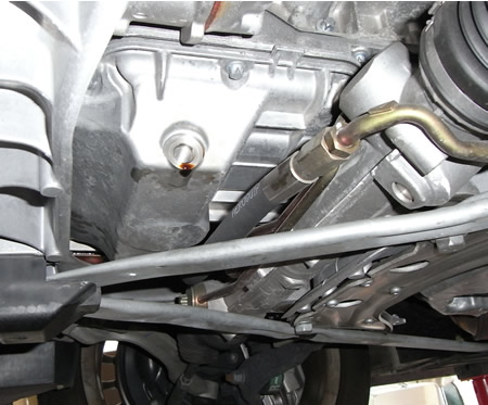 ドレンボルトはステアリングユニットをまたいでいるので2カ所から抜きます。ここは前側。