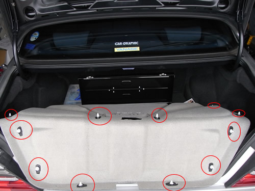 最初にトランクリッドの内張を外します。長めのマイナスドライバーでファスナーを折らないように抜いて行きます。画像のように数多くあります。 |