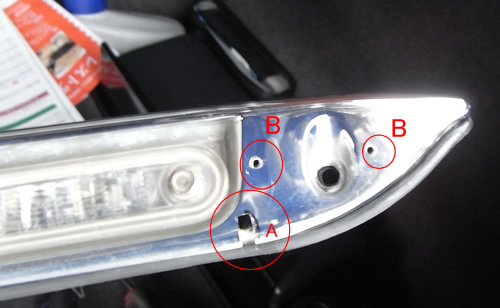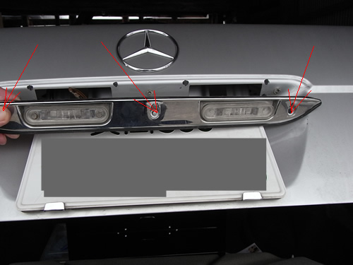 次にライセンププレートの照明件モールを外しました。赤い矢印3カ所のビスを外します。ラバーでくっついているのでトランクリッド内側から押すと取れました。(照明への配線は差し込みを抜いた) いろいろ考えた結果このメッキモールに穴を開ければ簡単にトランクリッド内側へ配線を引けると考え大胆にカットすることを決意。 |