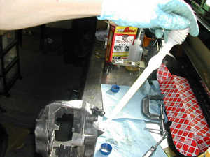 組み立ててから取り付けまで時間があるのでブレーキフルードを充填し内部に湿気がはいらないようにしておきます。ブリーダーを緩めての充填なので後のエアー抜きも早く済むでしょう。 |