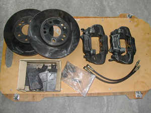 入手した部品のすべて。 キャリパーはきわめて丁寧なO/Hがされていました。 ローターは電動ワイヤーブラシでキレイにサビを落としました。 |