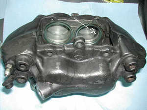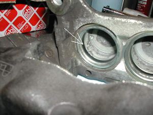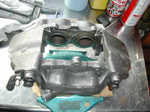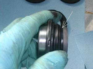 ピストンシールにはシリコンラバーグリスを塗布し取り付け。 ダストブーツにはピストンのくぼみに入る部分のみ同様のグリースをうすく塗布しピストンに取り付け。それ以外のキャリパーに付くところには絶対油分を付けないことがコツです。 矢印部分は入念に押し込む。 |