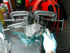 一番大変なキャリパーの洗浄はすでにされていたので助かりました。 バイスに固定し、矢印部分からマイナスドライバーなどでヒートシールド、ダストブーツを外す。 |