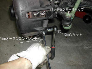 サクサクとキャリパー、パッドを外していきます。センサーの固定ボルトも・・。 |