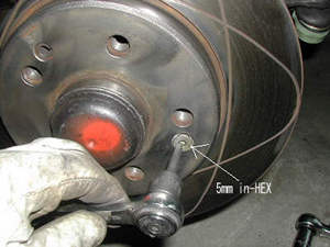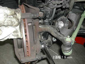 次にキャリパーをサポートしているブレーキアンカー 2面幅19mmのボルト2本ロングストレートのメガネで外します。 |