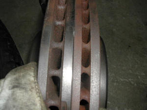 左はE320のローター7.0kg、右E280のローター5.8kg。厚さで3mm直径で10mmの違いがあります。ついでにキャリパーの重量も量ったところE320用は4.7kg E280 用はアンカーを含め4.0kg 合計ではE320が11.7kg E280が9.8kg その差1.9kgと意外と差が無いことがわかります。 |