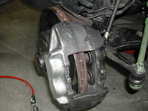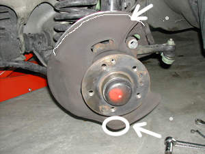 手順としてはジャッキアップ後ウマに載せ標準で付いているフローティングキャリパーを外し、ブレーキアンカーも外し次にローターを外す。取り付けはローター>キャリパー>パッド>センサー>ブレーキフルードのエアー抜きの順でやればOKと思われます。しかしE280Tに4PODキャリパーを付けられた「いのさん」 W201 2.5-16V にSL600の4PODを付けられた「よっしーさん」からの情報によるとローターがバックプレートに干渉してしまい、ここを加工しないといけないようです。某ソフトによるとE280とE320ではバックプレートの部品番号も違います。(あたりまえか?)