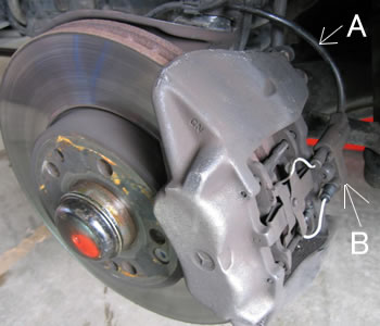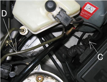 エンジンルーム内部のブレーキパッドセンサーからの配線、左はCの所、右はヒーターバルブの前にコネクターがありそこからキャリパーまでの配線を交換しました。 Dの付近から貫通するフェンダーのゴムグロメットはコネクターを分解すれば簡単に通せました。 |
