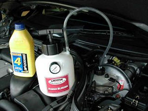 フロント2輪分なので約500ccほどフルードを入れ、10Psiまで加圧。ブリーダーバルブに透明なホースを付けエアーが出なくなるまでブルードを抜きます。 |