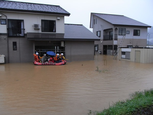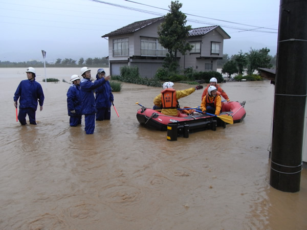 逃げ遅れた方の救助でレスキュー隊がボートで出動。