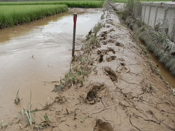 歩くのもままならない中、排水の溝を作りました。稲よ!頑張れ!