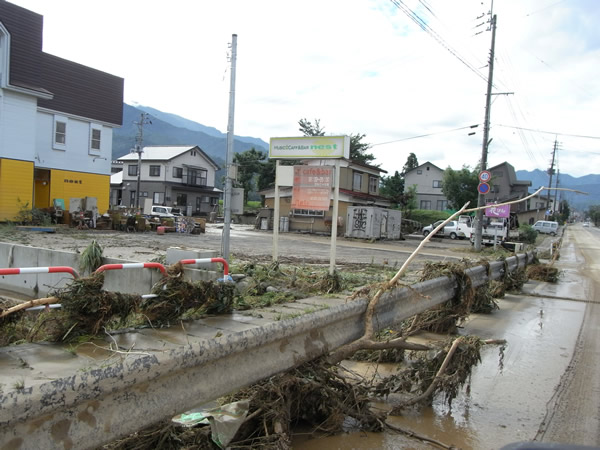 国道もドロと流木。ガードレールの基礎は流されて露出しました。