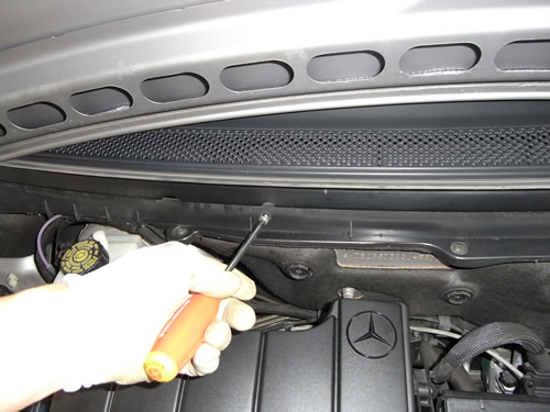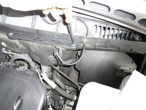 次にボンネトを開け丸い小さな穴が開いているパネル(エアーインテーク)を外します。ビス4本