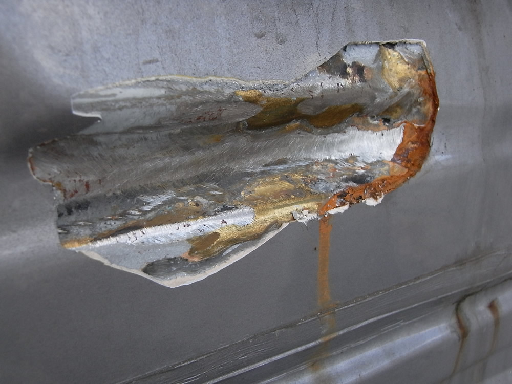 サビと5mm以上もあるパテが浮き上がりヒドイ状態ではありませんか!凹んだまま修正しないでサビも取らずパテ埋めしたような状態です。
