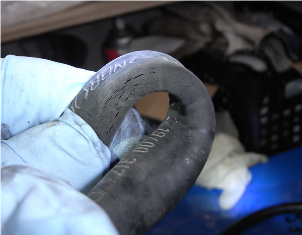 ヒビの入ったホース。冬季は寒さで硬くなり漏れが少ないようですが夏季は多く漏っていた可能性があります。