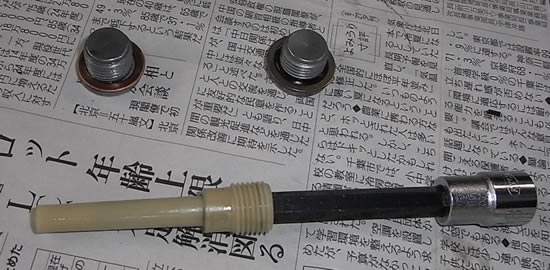 暖機運転の後 暖かいうちにドレン ボルト外してATF抜きます。ドレンボルトの奥にはさらにオーバーフローパイプがあるので