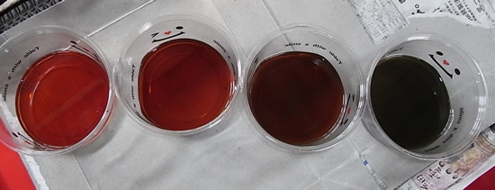 右は最初抜いたもの 左に行くほどきれいになってゆきます。一番左は3回目に新油入れオーバーフローで抜いた分。