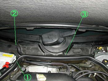Cフロントスクリーン下のラバーめくり3箇所のビスを外す。 Dプラスチックの白いピンがあるので引き抜く。 Eを力ずくで引っ張り外す。 |