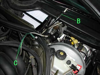最初奥というか上の方一枚をミゾに確実に押し込み次に手前を上画像矢印と反対方向にスライドさせて押し込みケースとの隙間がなく確実にはまっているかをチェック。 Bは同時に作業したスロットルワイヤー(エンジンルーム側に引き抜いたところ) Cは同じくバキュームホース |